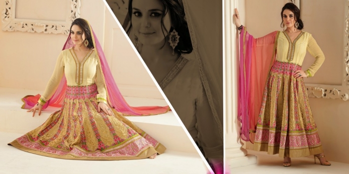 Majesty Cream Faux Georgette Salwar Kameez Comes With A Contrast Pink & Pale Tomato Chiffon Dupatta Paired With A Matching Bottom & Resham|Sequins|Stones work.
