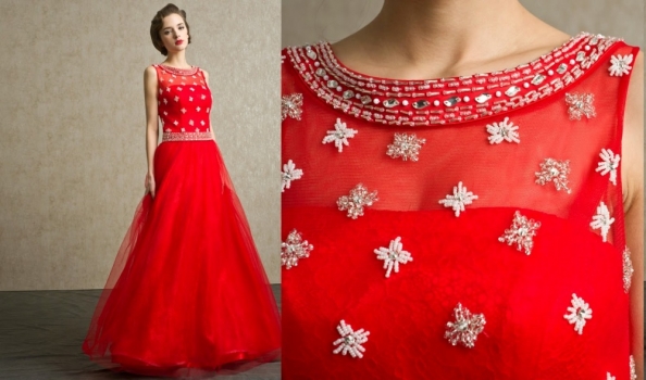 Aesthetic Red Net Dresses with Bugle Beads Cutdana|Fancy Embellishments|Moti|Multi|Stones.