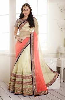 Off White & Peach Net & Satin Saree with Light Copper Brocade Blouse & Resham, Zari, Gota Patti & Patch Border Work.