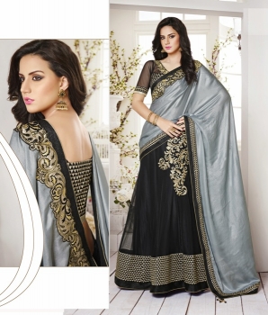 Grey & Black Faux Crepe Shimmer, Net & Satin Saree, with Black & Silver Net & Brocade Blouse & Resham, Zari, Stone, Applique, Lace Work & Patch Border Work.