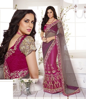 Violet & Fuchsia Pink Net & Satin Saree, Fuchsia Pink & Violet Velvet & Net Blouse with Resham, Zari, Stone, Lace Work & Patch Border Work.