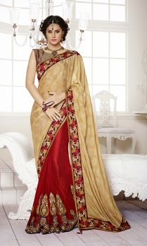 Beige & Red Faux Crepe Jacquard & Net Saree, Copper & Dark Brown Brocade Blouse with Resham, Zari, Stone, Bead, Applique, Lace Work & Patch Border Work.