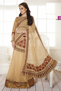 Beige Net Flock, Net & Net Jacquard Saree, Copper & Rust Brocade & Net Jacquard Blouse withResham, Zari, Dori, Stone, Applique, Lace Work & Patch Border Work.