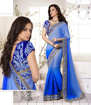 Shaded Blue Faux Chiffon Saree, Light Copper & Dark Blue Brocade & Velvet Blouse with Resham, Zari, Stone & Patch Border Work.