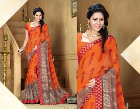 Orange Georgette Printed Saree with Orange Georgette Printed blouse.