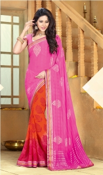 Orange+Pink Marble Chiffon Printed Saree with Pink Marble Chiffon blouse.