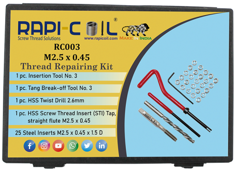 Article no. RC003 Size. M2.5 x 0.45 Contents High Speed Steel Screw Thread Tap M2.5 X 0.45 - 1pcs, HSS Twist Drill 2.6mm - 1pcs, Insert Installation Tools No. 3 - 1pcs, Break-Off Tang No. 3 -1 pcs, Stainless Steel Helical Insert M2.5 x 0.45 - 25Pcs.