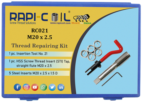 Article No. RC021 Size. M20 x 2.5 Contents High Speed Steel Screw Thread Tap M20 x 2.5 - 1pcs Insert Installation Tools No. 21 - 1pcs Stainless Steel Helical Insert M20 x 2.5 - 5pcs