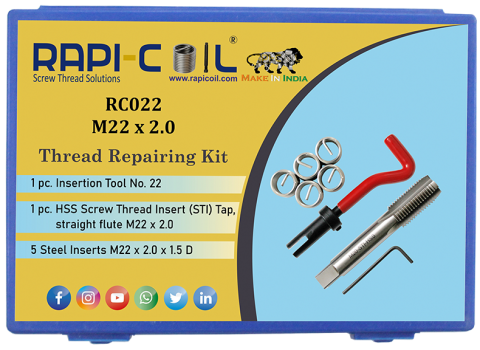 Article No. RC022 Size. M22 x 2.5 Contents High Speed Steel Screw Thread Tap M22 x 2.5 - 1pcs Insert Installation Tools No.22 - 1pcs Stainless Steel Helical Insert M22 x 2.5 - 5pcs
