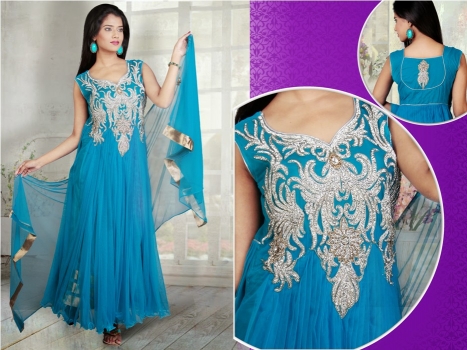Bondi Blue embroidered festival anarkali kameez intricate with zari thread, stone work, patch work, neck work, floral work and leaf work.No embroidered work is done on the backside of the kameez.Available with Bondi Blue Shantoon Churidar and Bondi Blue Net Dupatta.This ready made kameez is available upto chest size 42 with matching sleeves of 5-6 inches.
