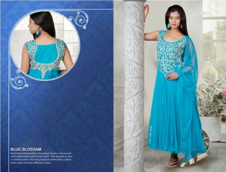 Bondi Blue embroidered festival anarkali kameez intricate with zari thread, stone work, neck work, floral work and leaf work.No embroidered work is done on the backside of the kameez.Available with Bondi Blue Shantoon Churidar and Bondi Blue Net Dupatta.This ready made kameez is available upto chest size 42 with matching sleeves of 5-6 inches.