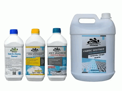Uniwax Cloth dry cleaning chemical - 1 kg Fabric brightener - 1 kg Oxy bleach - 1 kg Fabric whitener - 5 kg Dose - in 20 liter water 100 ml - uniwax Cloth dry cleaning chemical 5ml- Fabric brightener 20gram - Oxy bleach 100 ml- Fabric whitener wash for 30 to 45 minutes