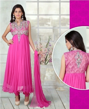 Deep Pink embroidered festival anarkali kameez intricate with zari thread, stone work, sequins, neck work, floral work, patch work, leaf work and keri work.No embroidered work is done on the backside of the kameez.Available with Deep Pink Shantoon Churidar and Deep Pink Net Dupatta.This ready made kameez is available upto chest size 42 with matching sleeves of 5-6 inches.