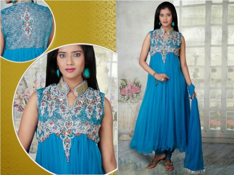 Deep Sky Blue embroidered festival anarkali kameez intricate with zari thread, stone work, sequins, neck work, floral work, patch work, leaf work and keri work.No embroidered work is done on the backside of the kameez.Available with Deep Sky Blue Shantoon Churidar and Deep Sky Blue Net Dupatta.This ready made kameez is available upto chest size 42 with matching sleeves of 5-6 inches.