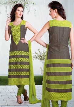 Contemporary Deep Gray Salwar Kameez Paired With A Contrast Lime Green Cotton Chudidar Comes With A Contrast Lime Green Chiffon Dupatta.